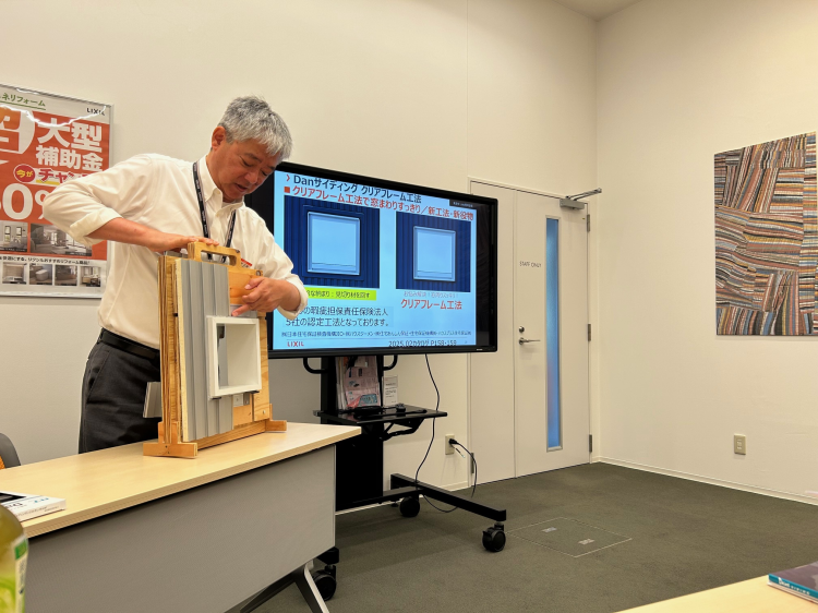 LIXILさん取り扱い商品のDanサイディングの特徴や他社や他工法との違いを細かく講義してくださいました。ルミフロン塗料やフッ素鋼板、クリアフレーム工法…