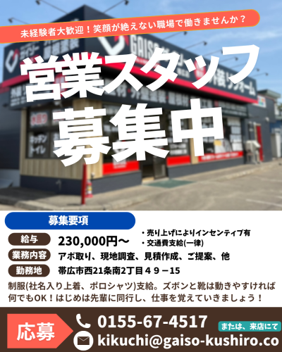 ガイソー帯広店では一緒に働いてくれる営業スタッフ(正社員)を大募集しております!!